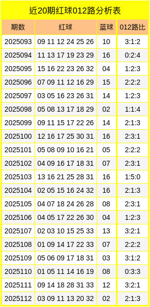 双色球第2025112期开奖,红球:03、09、11、13、20、32,蓝球:02。其中红球012路比为2:1:3,蓝球开出2路号码。