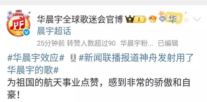华晨宇全球歌迷会官博,在社交平台发文,公开了这样一个关于华晨宇的好消息! 于是,从华晨宇的歌曲到歌手华晨宇本人,也就引人关注!“跳吧在无比宏大的星系,喝吧要沉迷洪荒的美丽……”神舟飞船升空后,前来围观的观众们,欢呼声一阵接着一阵。歌曲的豪情壮志和神舟飞船升空的壮举场面,一起烘托感人至深的欢喜氛围!
