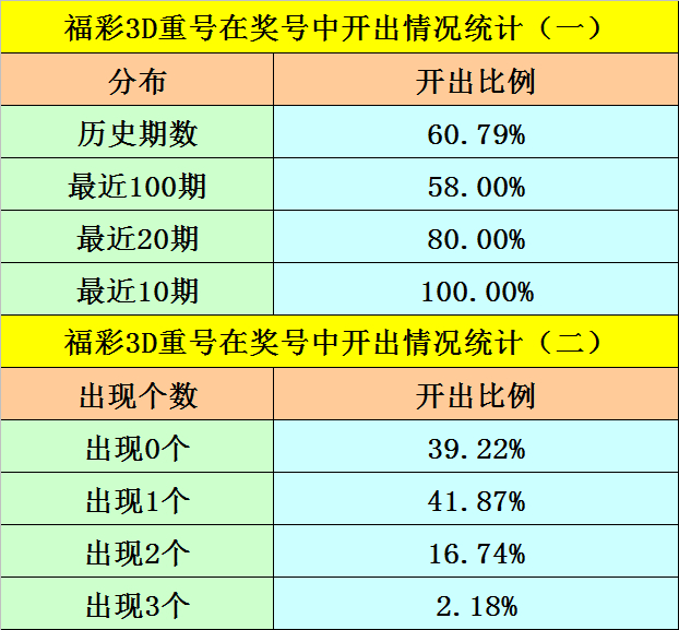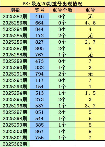 最近100期开奖中,含有重号的奖号有58期,最近20期含有重号的奖号有16期,最近10期含有重号的奖号有10期。本期排除重号。