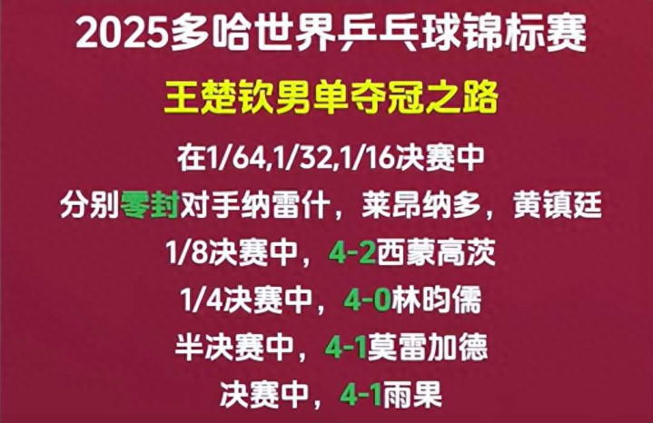 王楚钦的经历最让人揪心,去年奥运会打到三十二强就出局,被人骂得挺狠,今年世乒赛拿了冠军,央视说他是领头的,接着世界杯一场场硬拼,最后拿下了冠军,这二十五岁的小伙子,像在拼命翻盘,对小勒布伦,从零比一追到四比二,看得人直捏汗,对达科,一度一比三落后,连扳三局,决赛对松岛辉空,又是三比二险胜,三场关键战,全靠咬牙撑下来,这冠军,是真的一分一分拼出来的。