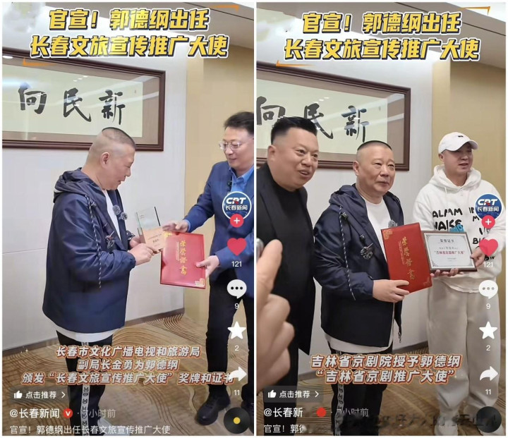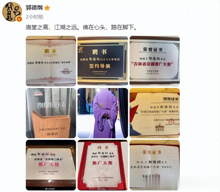 德云社郭德纲发文,晒聘书、牌匾,一组九宫格照片,吸引了粉丝、网友的注意。从晒照可以获悉,郭德纲喜提4个新身份,有来自官方,有来自企事业单位。可以说,这4个身份,含金量都不低,是政府部门、业界同行等对郭德纲的认可和支持。聘书、牌匾都来自哪4家单位呢?又都给郭德怎样的身份呢?为什么郭德纲会如此备受认可呢?
