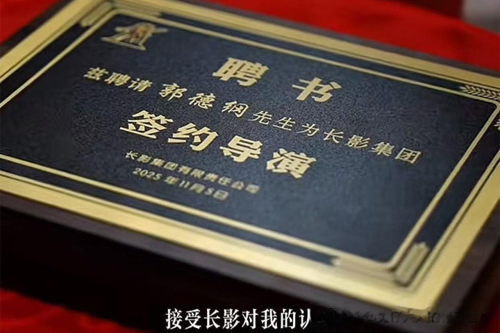 一组九宫格照,八张照片是聘书、牌匾,一张是昨晚麒麟剧社的幕后背影照。聘书、牌匾都很正规、精美。第一份,是来自长影集团的聘书,聘请郭德纲为长影集团的“签约导演”。长影集团的前身是长春电影制片厂,是新中国的第一家电影制片厂。《开国大典》、《平原游击队》等经典影片都是该厂创作的。长影集团能够向郭德纲抛出橄榄枝,能够聘请郭德纲为“签约导演”,这是对郭德纲创作、导演等能力的认可。