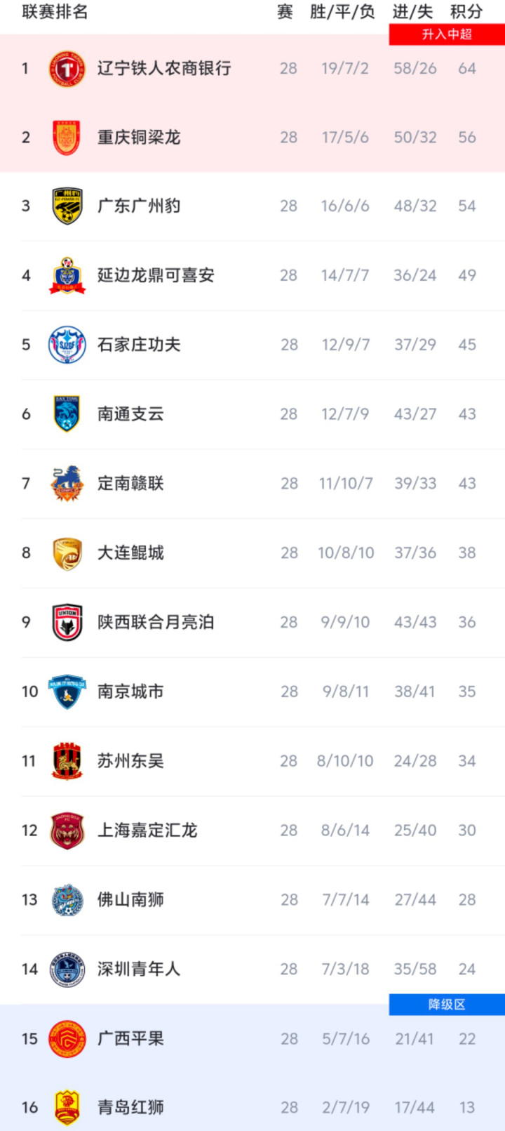 虎扑10月27日讯中甲联赛第28轮的比赛于昨日全部完赛,本轮赛况如下。