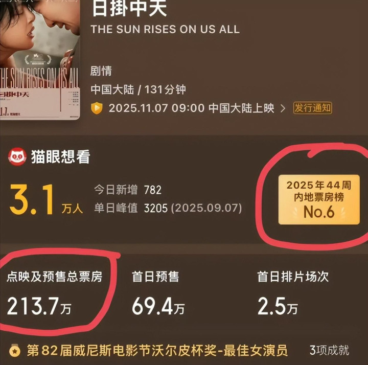 有票房预测机构《日掛中天》最终的票房应该在2500万~4000万之间,和大家此前的预期相差甚远。