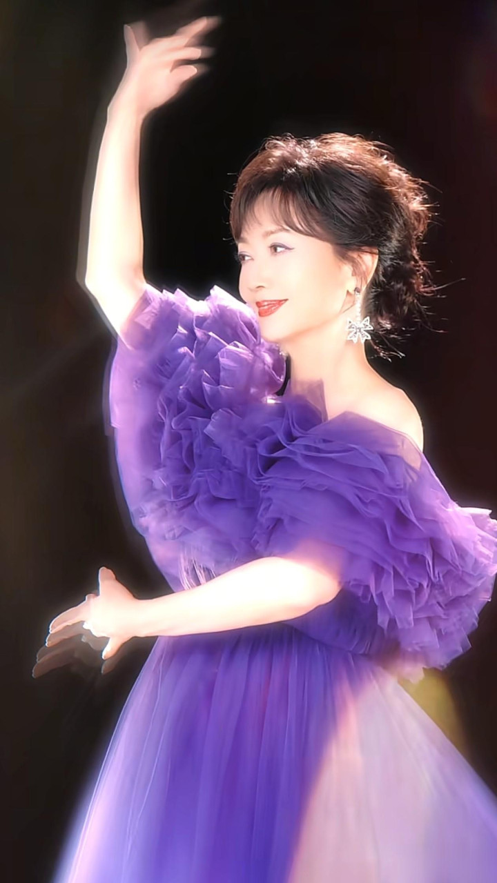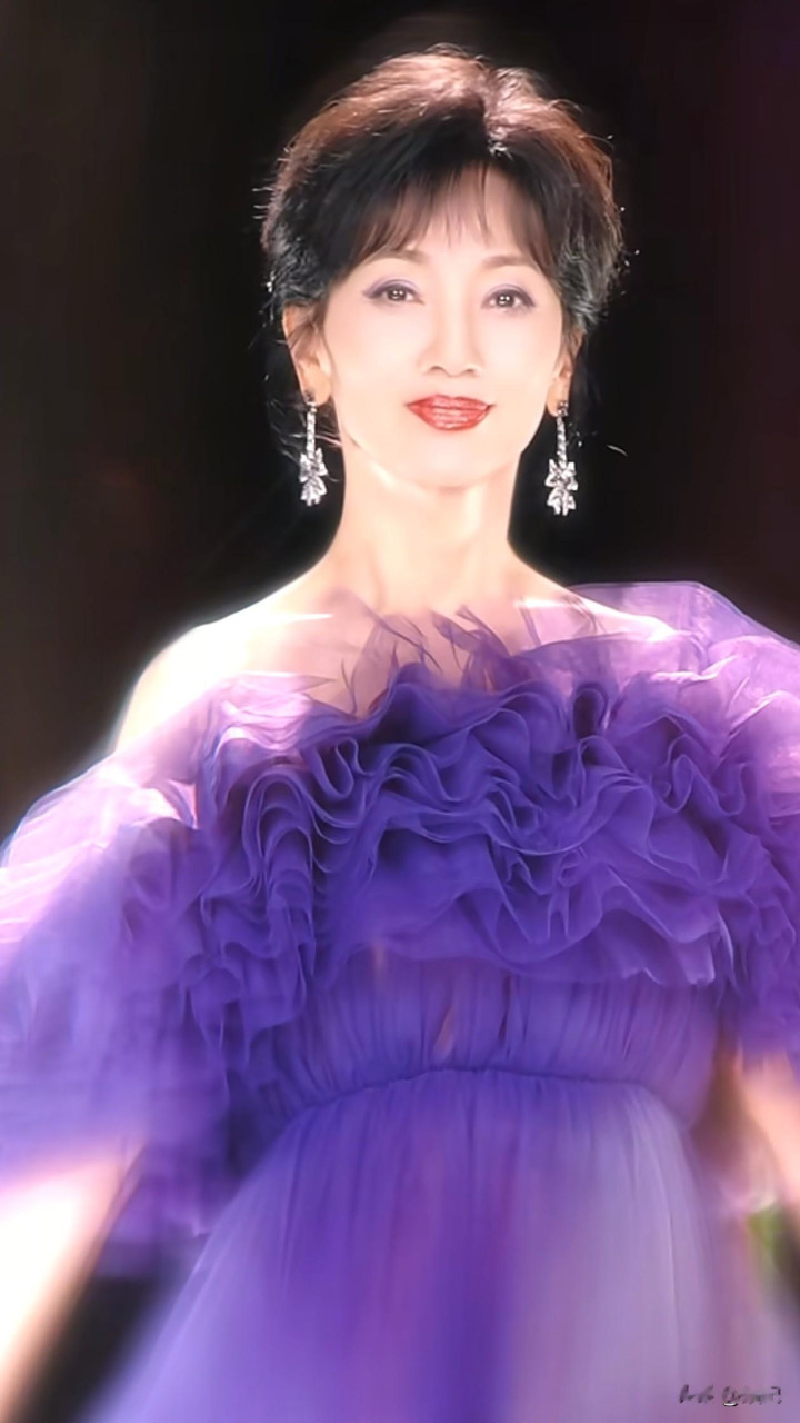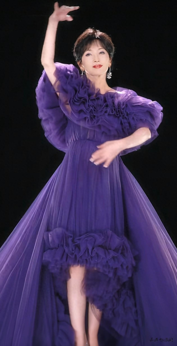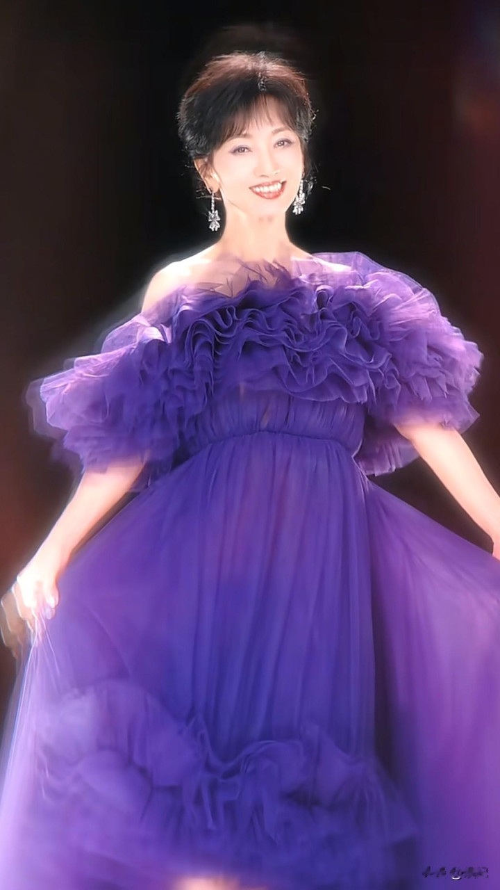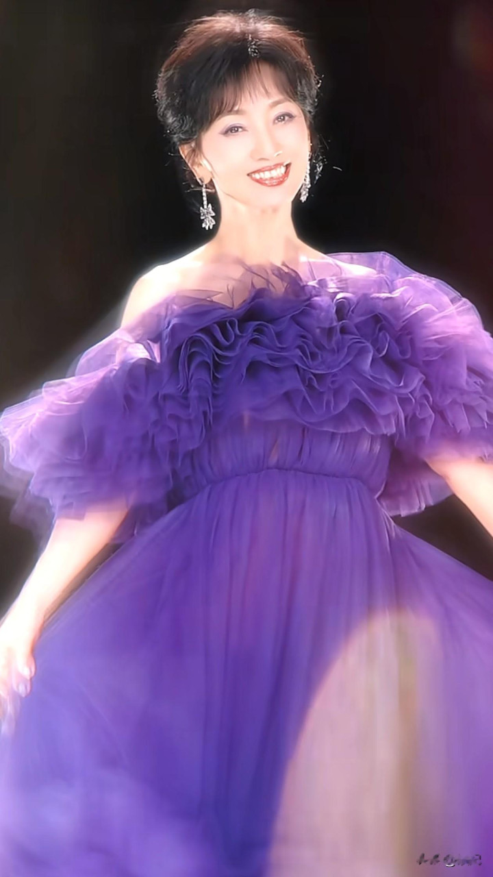 71岁赵雅芝身穿紫色抹胸裙, 笑容灿烂, 身材苗条, 美得像51岁