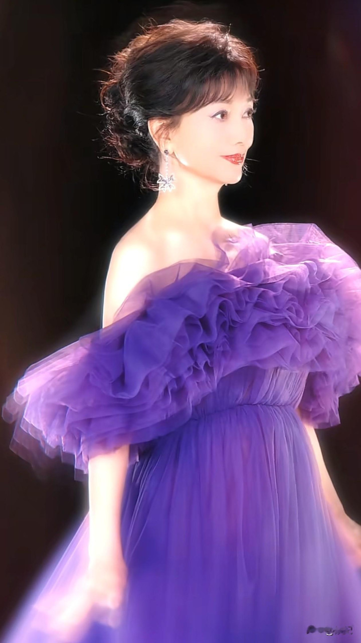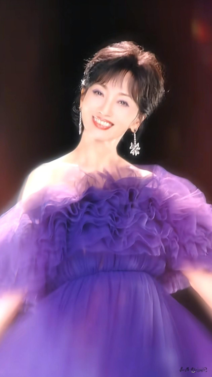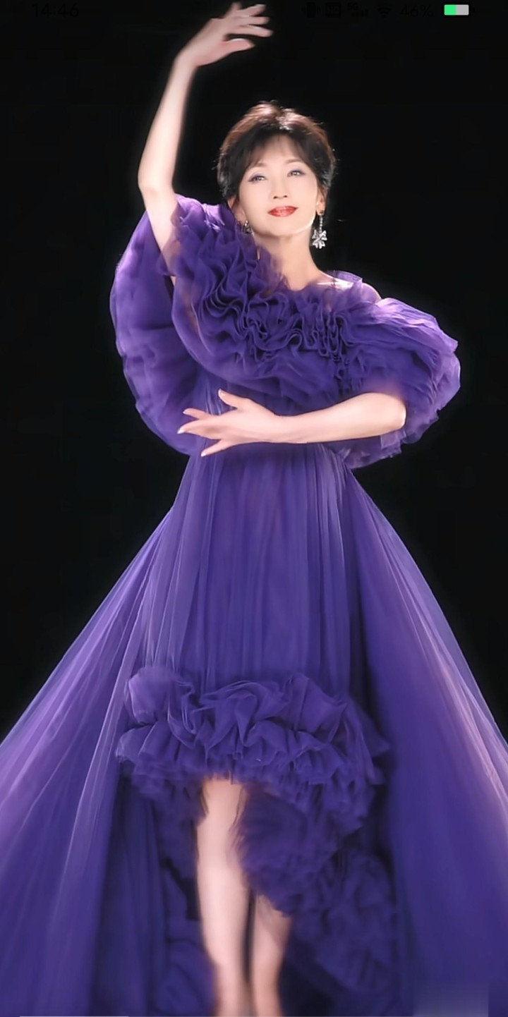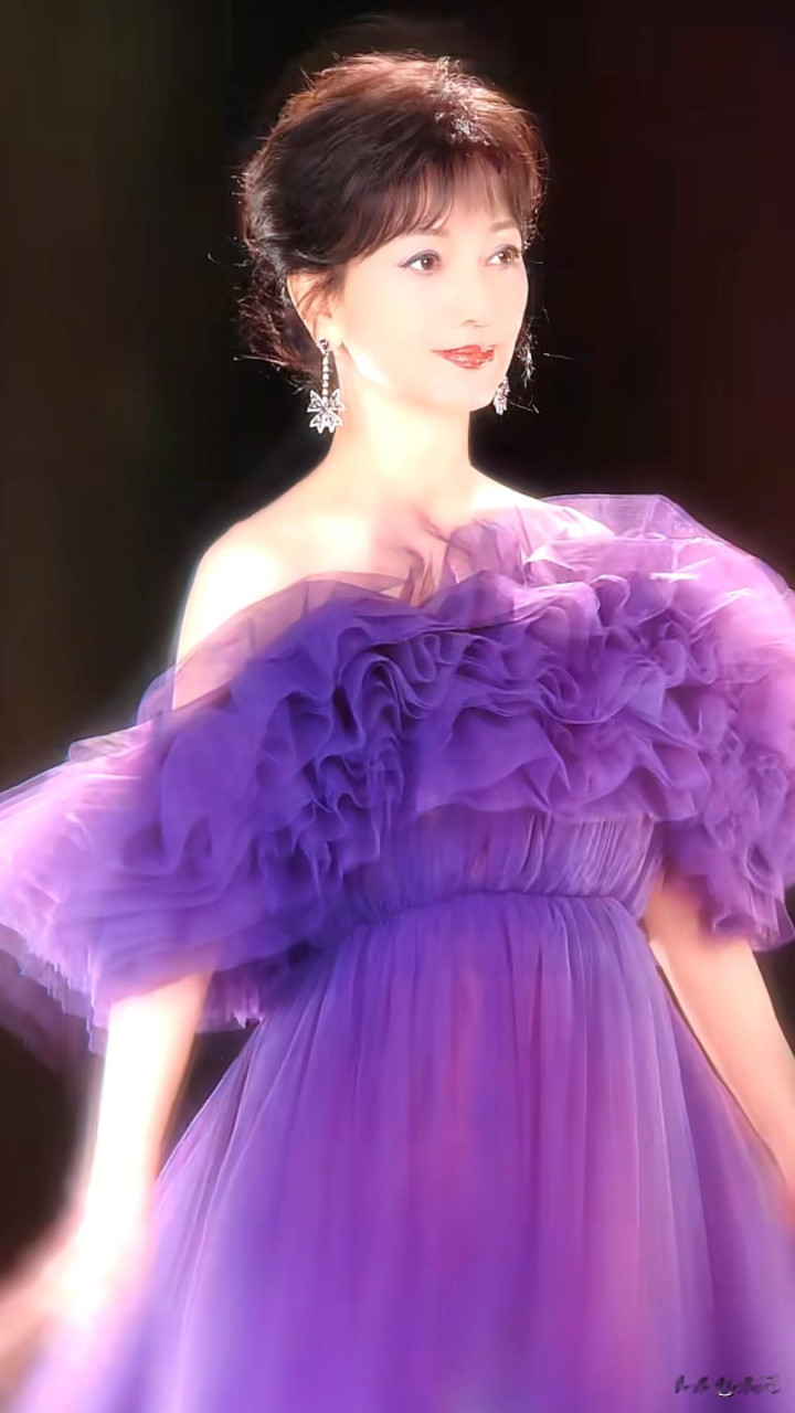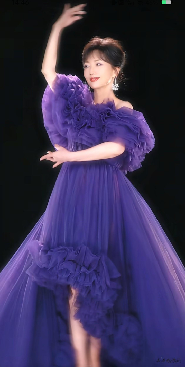 71岁赵雅芝身穿紫色抹胸裙, 笑容灿烂, 身材苗条, 美得像51岁