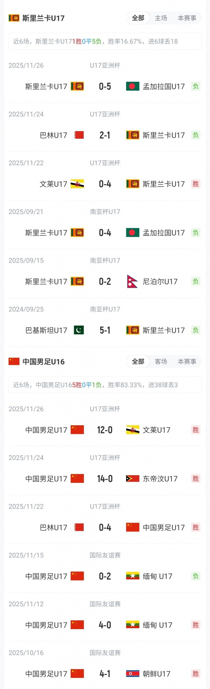 U16国足前3轮全胜,并狂轰30球0丢球,分别4-0巴林U16、14-0东帝汶U16、12-0文莱U16;斯里兰卡U16前3轮1胜2负,分别4-0文莱U16、1-2巴林U16、0-5孟加拉U16。