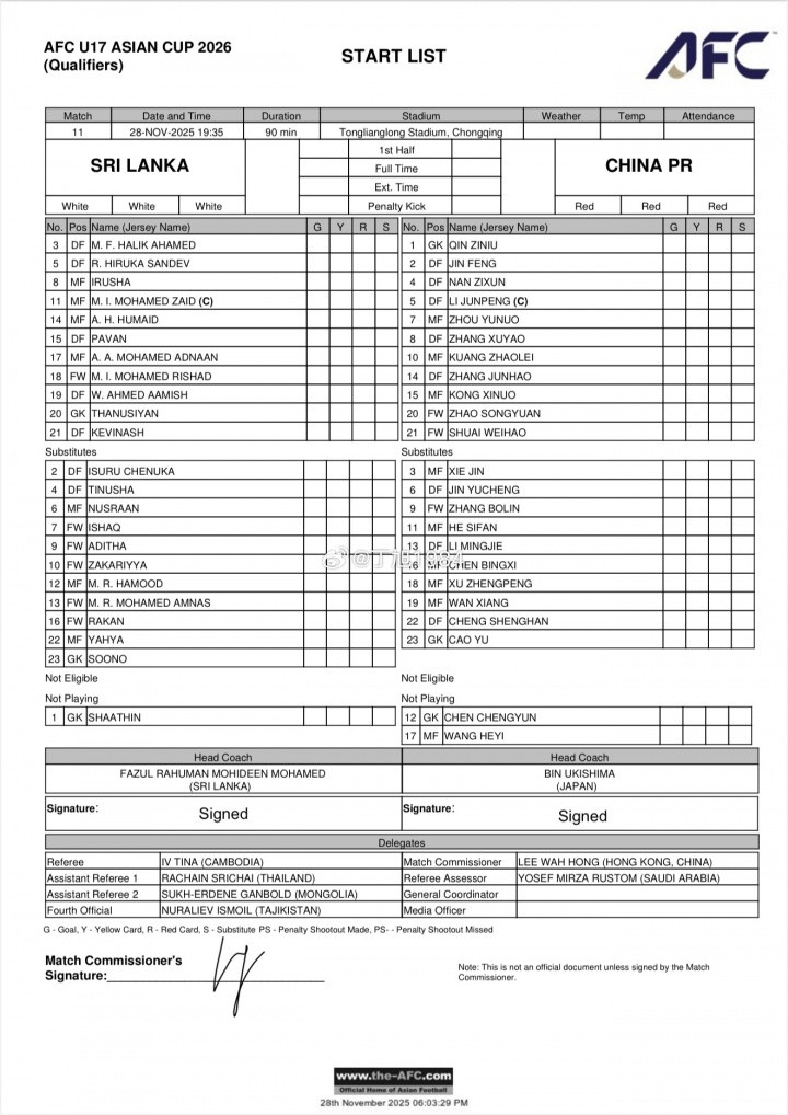 直播吧11月28日讯U17亚洲杯预选赛A组第4轮,U16国足vs斯里兰卡U16,赛前双方首发公布。
